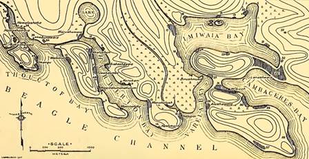 Fig. 1. Mapa del casco de Harberton y estaciones vecinas anotadas en yágankuta (Lothrop, 1928)