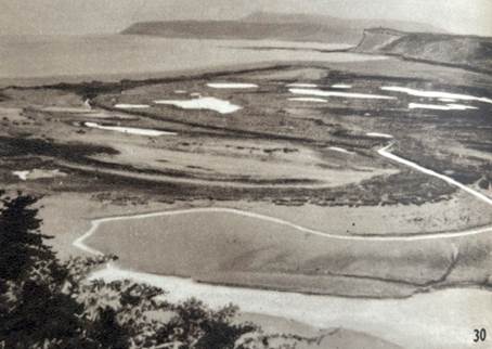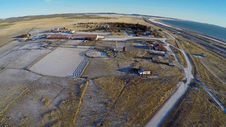 Fig 3. Boca del río Ewan con la comarca de Shilan al fondo, vista de los cañadones del mismo río (Lanushwaiwa, 1949, láminas 29 y 30) y vista aérea de Shai-w-num/casco de estancia Viamonte, donde cada temporada de esquila se renovó el acuerdo de 1907 entre la clase obrera sélknam y colonos que adhirieron al acuerdo (videograma de J. Bascopé, invernada del año 2018, con Shaipöot/Río del Fuego y Zaazket’/Punta María en el horizonte)