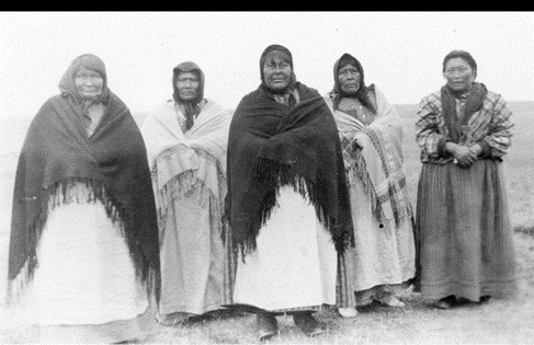 Fig. 17. De pie: Shishkolh/Soldado (a la derecha) de Najmishk y Kilehehen (llanero, aliado post jelj, “padre” adoptivo de Lanushwaiwa) se habían enfrentado en el combate de Yewin. Sentados: Pahchik (derecha), Echo (apodado “el anciano de Shaipöot”), Halah y Kautempklh. (Foto tomada en 1910 por Carlos Gallardo y publicada en Lanushwaiwa, 1949, lámina 53). Agregamos los nombres registrados en la crónica de la hija de Echo, Scemitrén, su hermano Gmescten (de madres muertas y nombres no registrados), Koscmot, hijo de Pahchik y madre fallecida (de nombre no registrado), Atsotte, Alilesh y la joven Kaiten, mujeres relacionadas con Pahchik, Caupatipesc, Chániutá, Casutá y la referencia de que Kilehehen tuvo dos hijas y dos hijos, de nombres no registrados (Lanushwaiwa, 1949, p. 385), a falta de más datos sobre esta foto