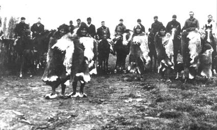Fig. 2. Llaneros de nombres no identificados, en trato con colonos de Ona Usin. Foto de A. Cameron (Lanushwaiwa, 1949, lámina 33)