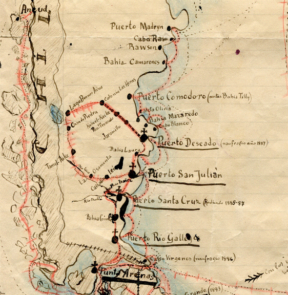 Otro dispositivo, en el que se manifiesta la variación de la orientación congregacional hacia este pueblo, es observable en las misiones volantes o estacionales que tuvieron continuidad durante todas las décadas en que actuó en la región. Tanto un reporte[31] como un mapa que él mismo confeccionó[32] dan cuenta de la dimensión espacial, las direcciones y la frecuencia de estas. Como puede observarse, un circuito terrestre unía San Julián y Puerto Deseado con parajes situados al sur ‒Bahía Coinlet‒, el oeste y el noroeste, remontando el río Chico: Paso Ibañez, Cañadón León, La Osamenta, Tamel Aike, Casa de Piedra, Lago Buenos Aires, Colonia Las Heras, Coluel Kaike, Pico Truncado y Jaramillo, y alcanzaba Bahía Laura en la costa del Atlántico. Mediante transporte marítimo, se accedía en dirección norte a Cabo Blanco, Bahía Mazaredo, Caleta Olivia y Puerto Comodoro. A estas misiones, que fueron amplificando recorridos a lo largo de los años, deben sumarse aquellas que, partiendo desde Punta Arenas, alcanzaban la cordillera, el centro del territorio y Puerto Deseado, de a caballo.